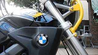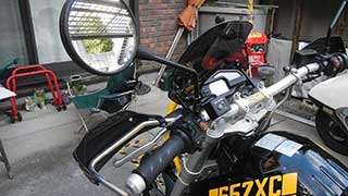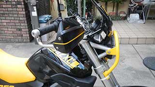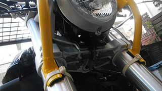 ワンオフで特注したアルミ製黄色パイプのライトガードは車検時にすぐ外せるようになっています |