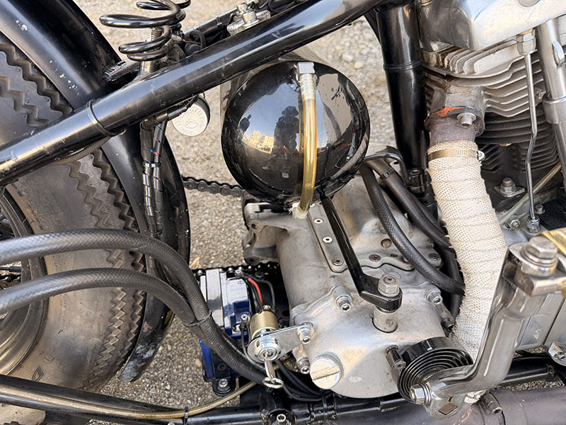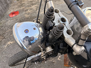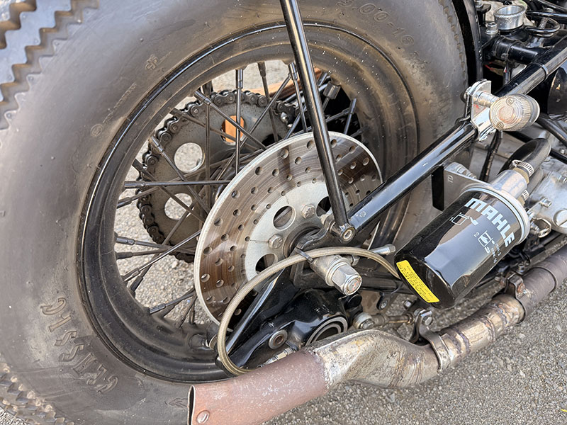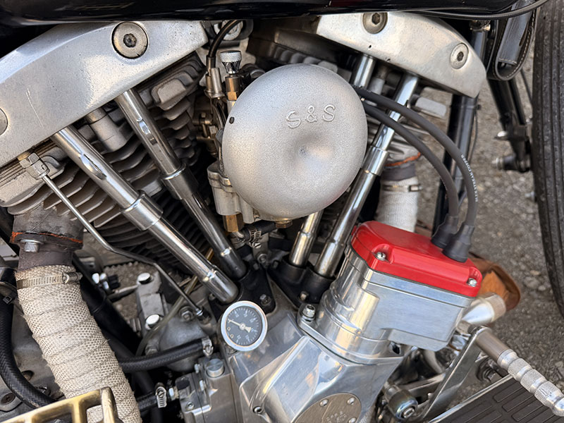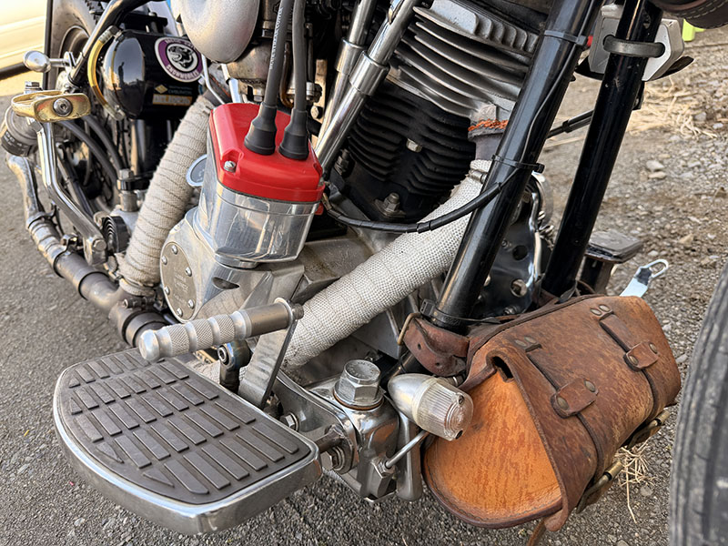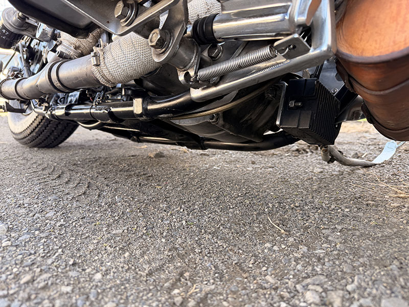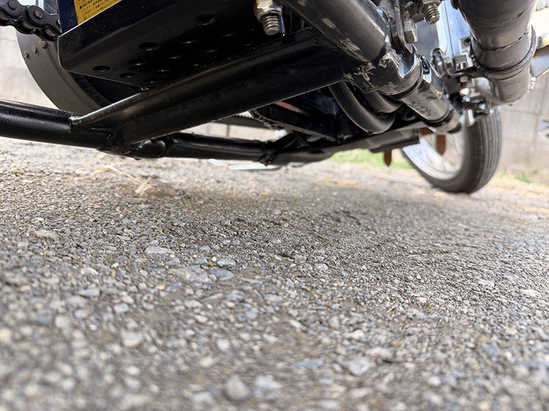 マフラーは純正パンヘッド用で、マフラー手前のパイプ内にローパスバッフルを入れています。