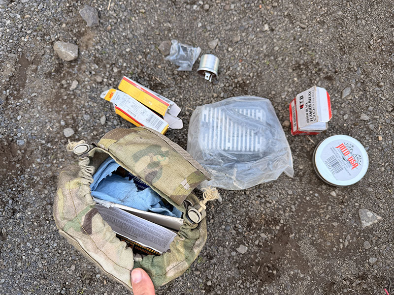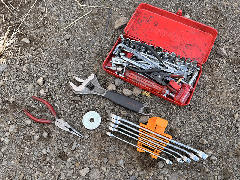ツーリングに必要な工具とスペアパーツ類も収納バックに入れてあります。