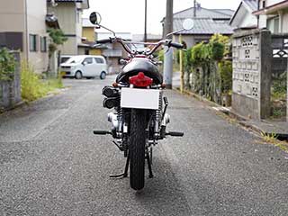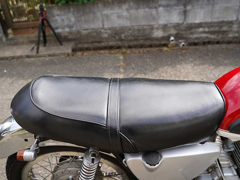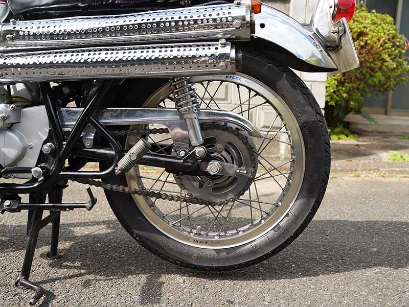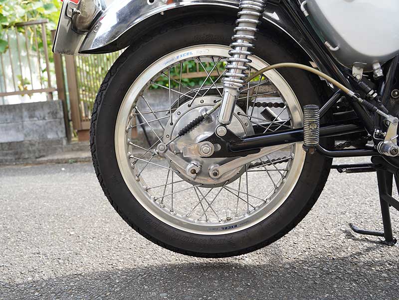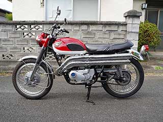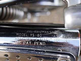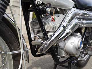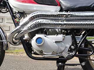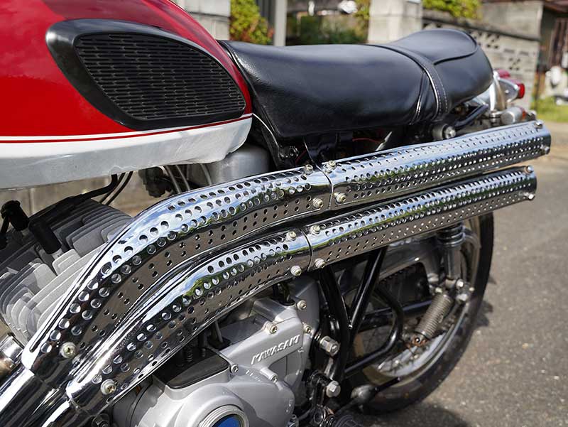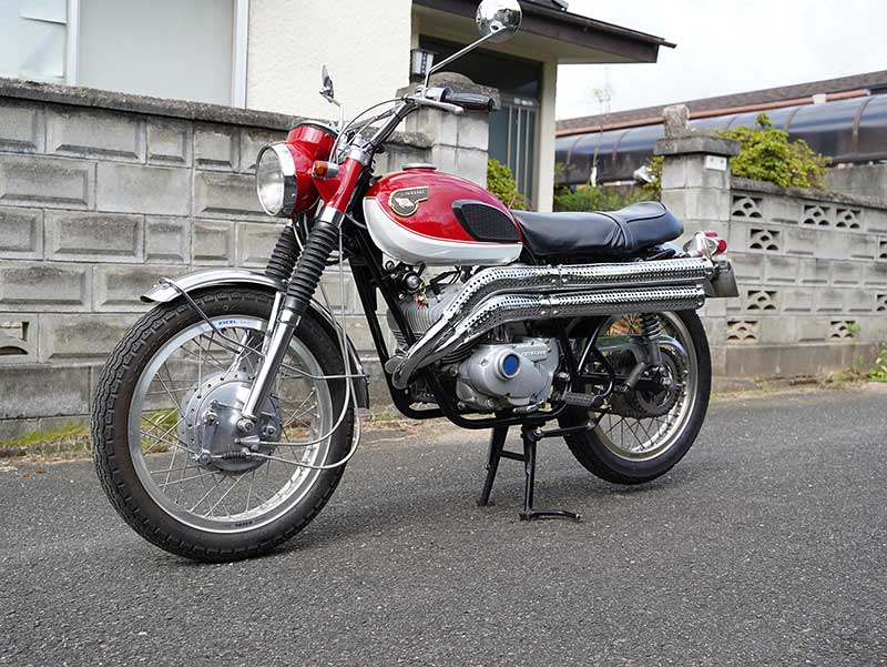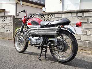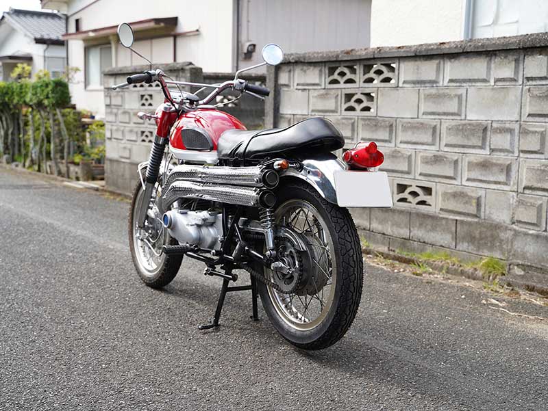 資料によりますとA1およびA1SSは元々輸出メインで製造されていたようで、そもそもの国内の流通量が少なく、さらにその中でもこちらのスクランブラータイプのA1SSはかなり球数の少ないバイクのようで、現オーナー様も探すのに苦労されたようです。こちらの車体も元々は輸出されて海外にいた車両との事で、マフラに輸出仕様である証が見られます。