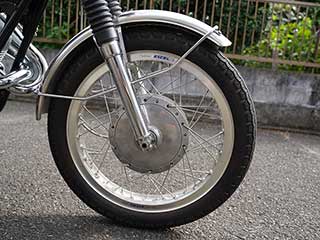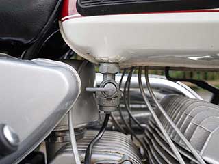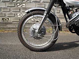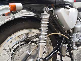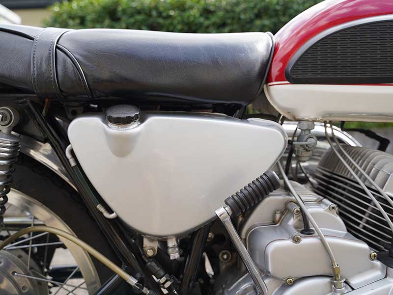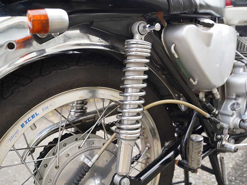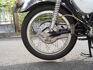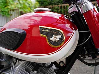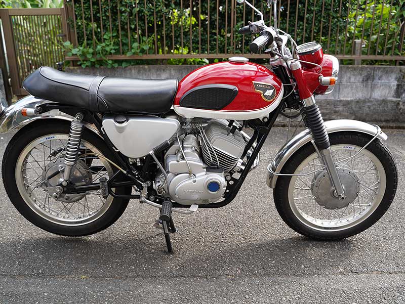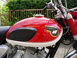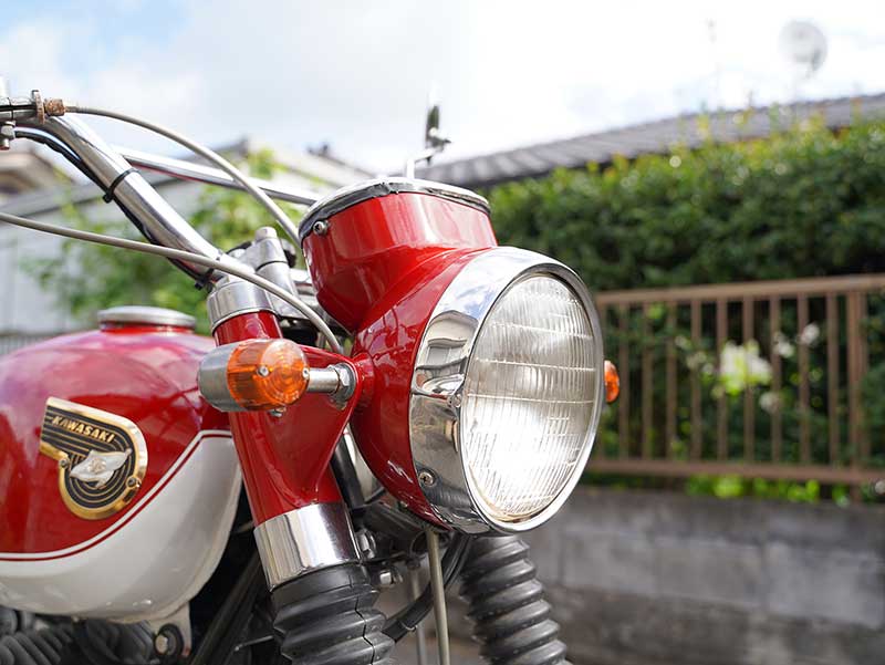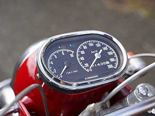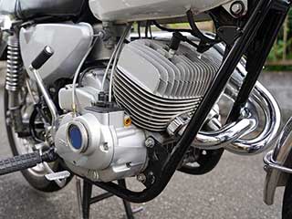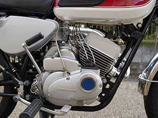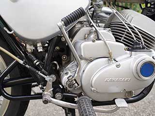 レストアの際各部掃除や研磨をされたようで、入り組んだ空冷のフィンも非常にきれいな状態です。1960年代当時では珍しかった分離給油機構 (カワサキでは「スーパールーブ」と呼んでいたそうです。) が搭載されております。2サイクルエンジン車はキャブレターの燃調含めオイル排出量の調整も非常に重要ですが、オーナー様が1000km走行した際には特に焼き付きなどのトラブル無く快調に動作しているとの事です。取材時には冷間でキック2〜3回で始動し、燃調も良好な状態という印象を受けました。