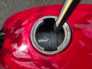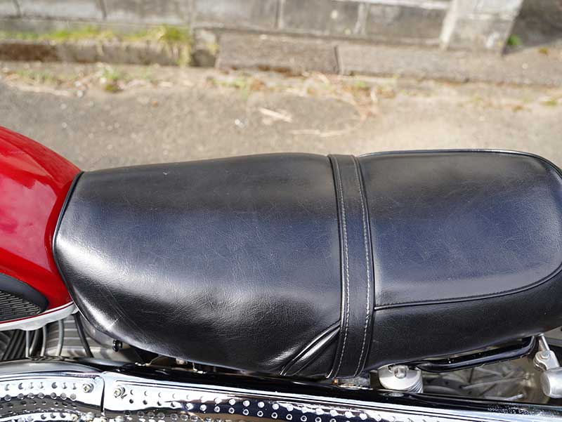 初期型の丸みのあるタンクで、当時物の純正品とのことです。再塗装されているかどうかは不明とのことですが、劣化しやすい赤色もきれいに艶を保っています。錆びやすいフューエルコック回りもほぼ錆び見られず良好な状態です。タンクパッドも劣化や目立つ汚れございません。内部も見える範囲は錆もなくきれいな状態です。タンク左右の特徴的なエンブレムも目立つ錆びや傷などもなくきれいな状態で残っています。純正では銀色のエンブレムなのですが、こちら金色のエンブレムとなっており恐らく同年代のW系の純正エンブレムを使用していると思われます。