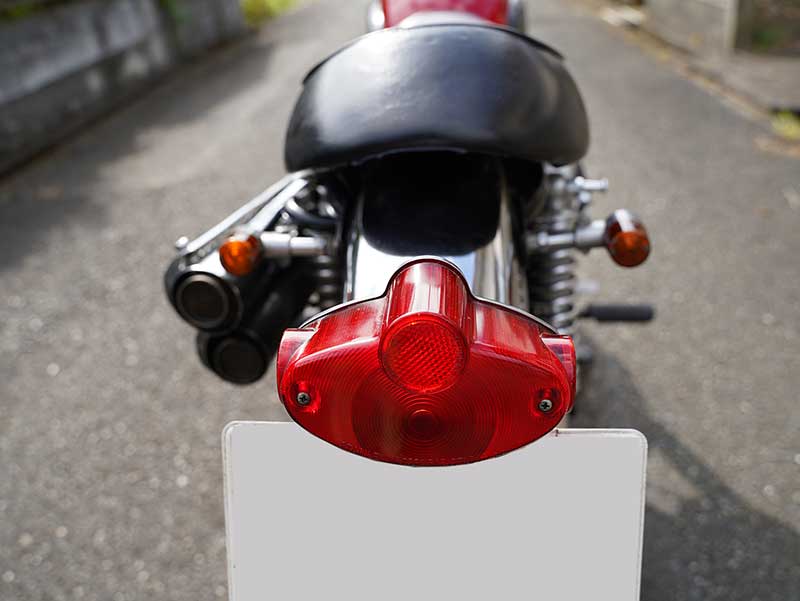 メーターは速度計・回転計一体型の純正です。メーターリングのメッキも目立つサビなく良好な状態です。走行距離はメーター読み1435kmですが、なにぶん古い車体ですので参考程度にお考え下さい。ウィンカー・テールランプレンズも当時物の純正との事です。メインキーは純正ではなく複製品になります。