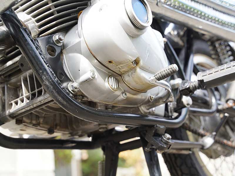 エンジンの左右カバー (キャブレターカバー) はカタログでは銀色一色なのですが、こちらの車両は一部に青い丸のデザインが見られます。おそらく当時のカスタム品かと思われます。