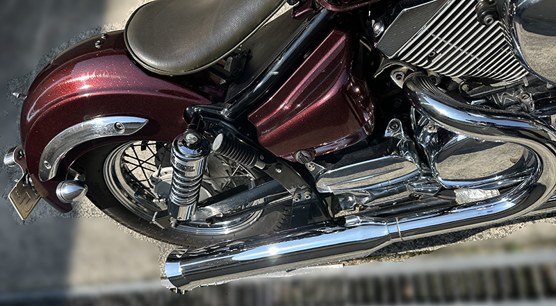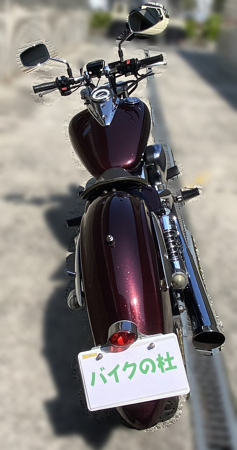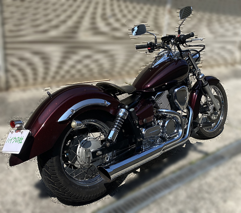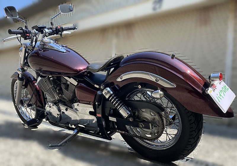 写真でも伝わる通り、全体のシルエットが非常にきれいで、ドラッグスター250らしい低く長いスタイルをしっかり楽しめる1台だと思います。